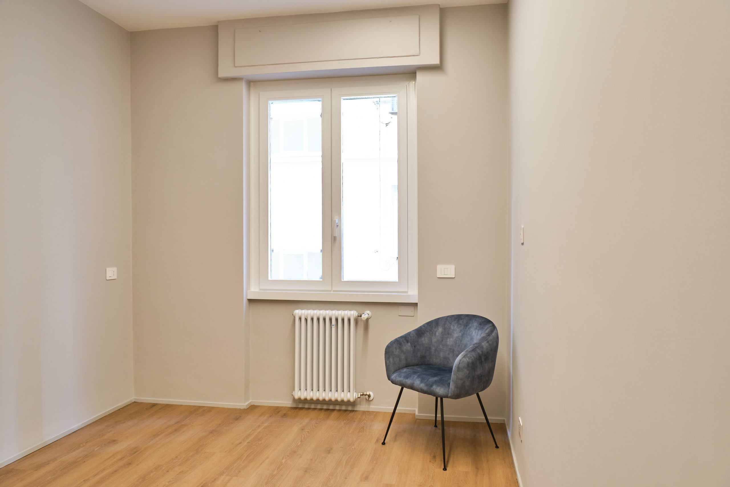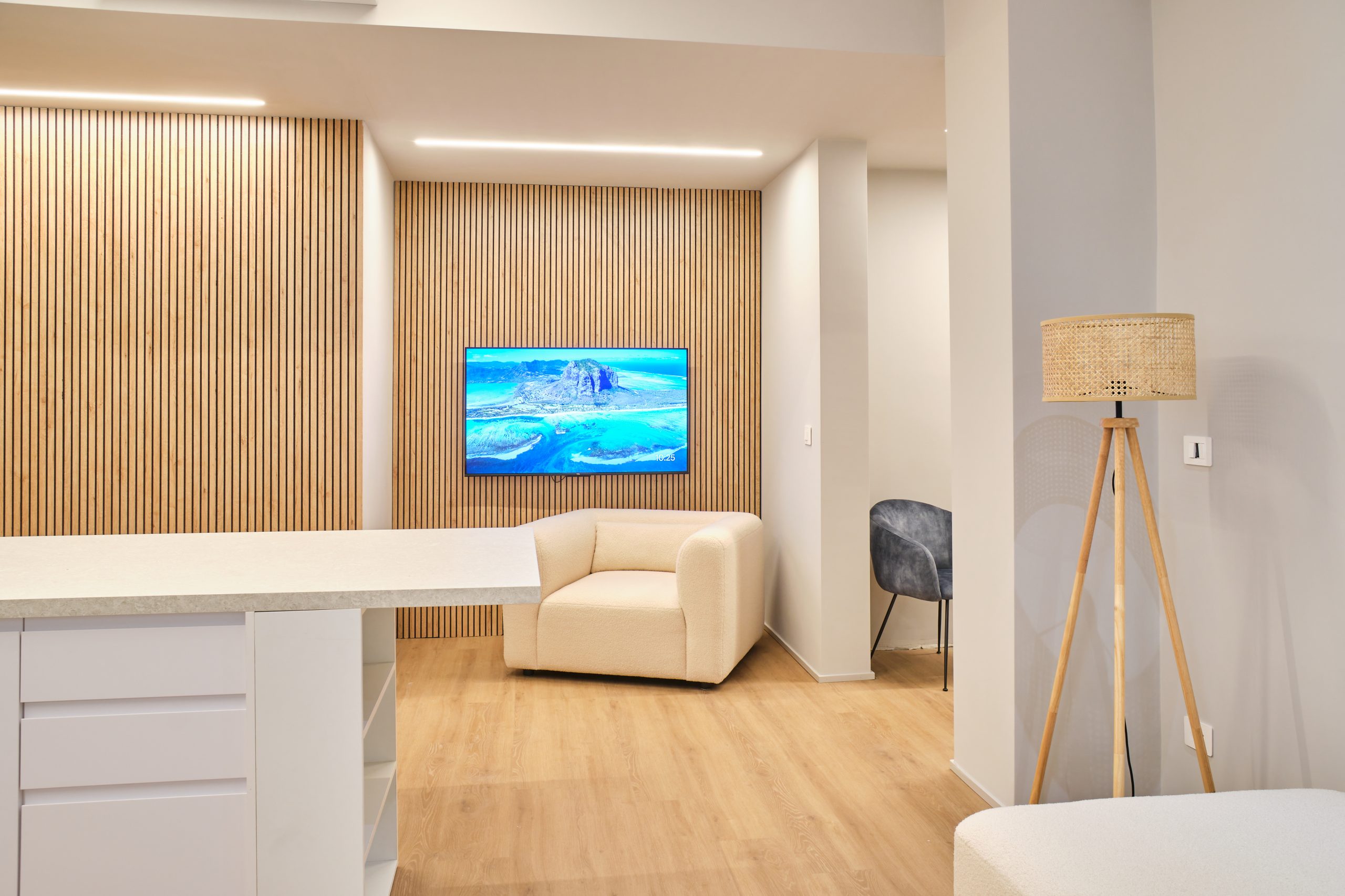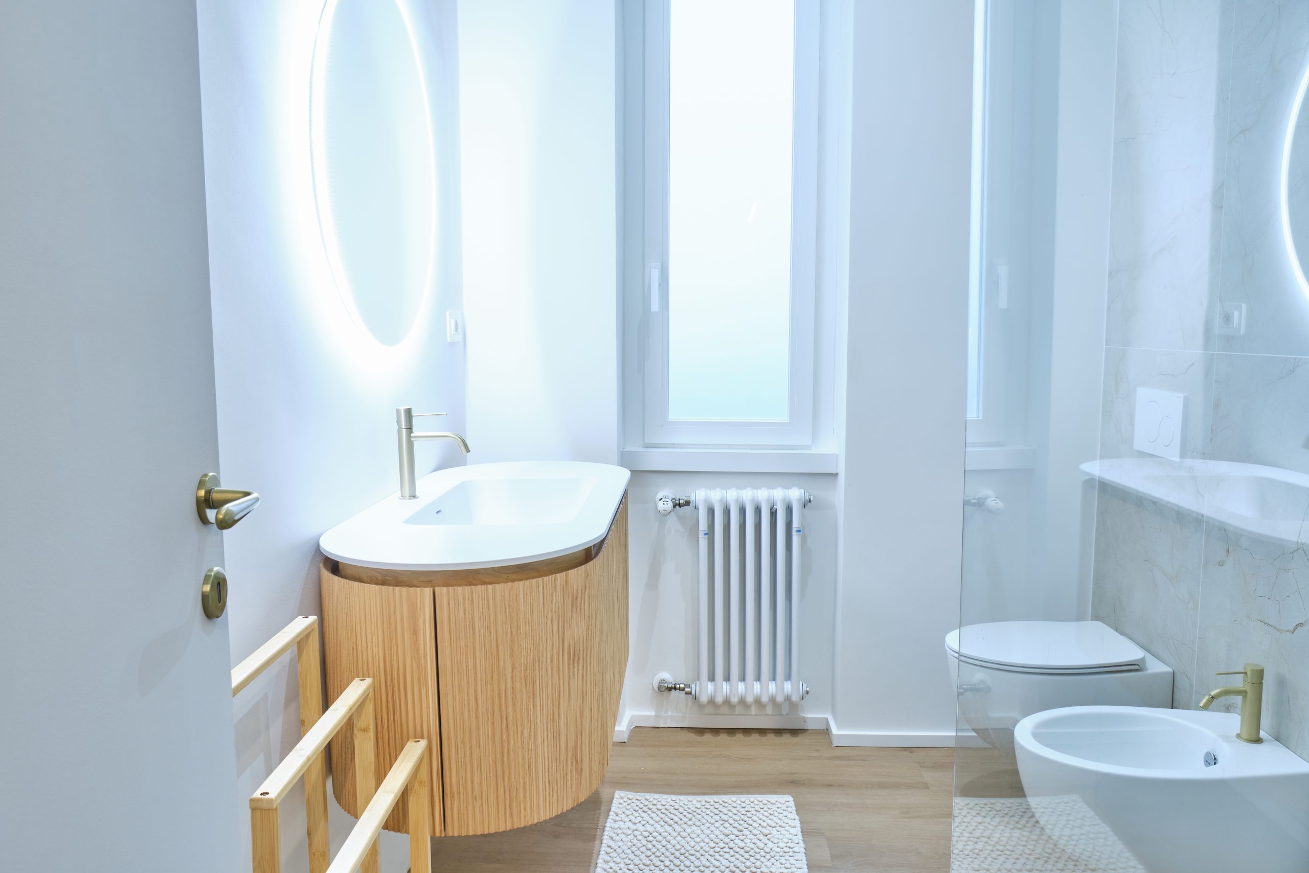 Abbiamo trasformato questa abitazione in uno spazio moderno, luminoso e funzionale, dove materiali naturali e linee pulite definiscono ogni ambiente. Il soggiorno, caratterizzato da toni neutri e da un elegante rivestimento in legno, offre un’atmosfera accogliente e contemporanea. Il bagno è stato completamente rinnovato con finiture minimal, sanitari sospesi e dettagli in ottone che aggiungono un tocco di raffinatezza.