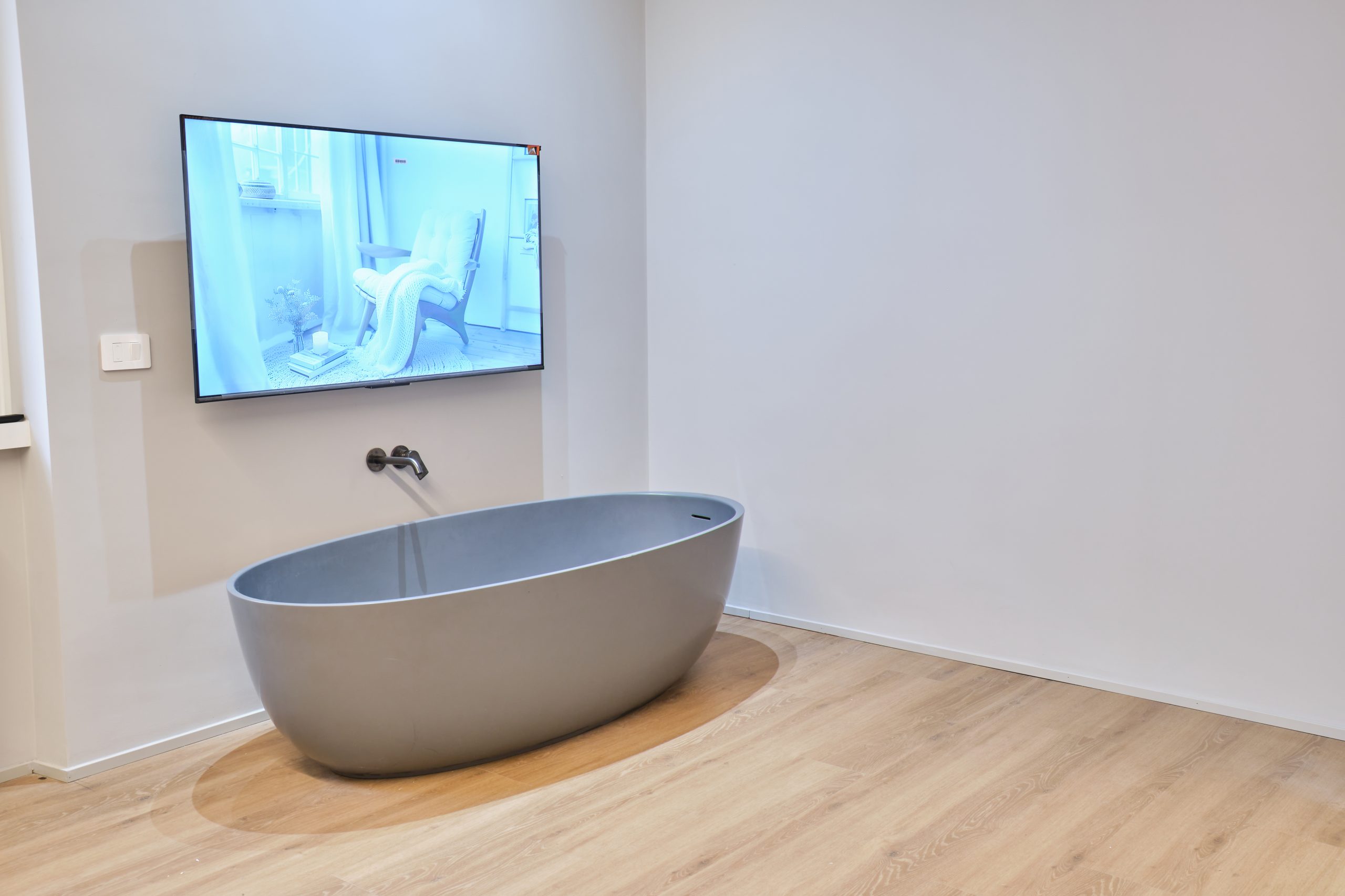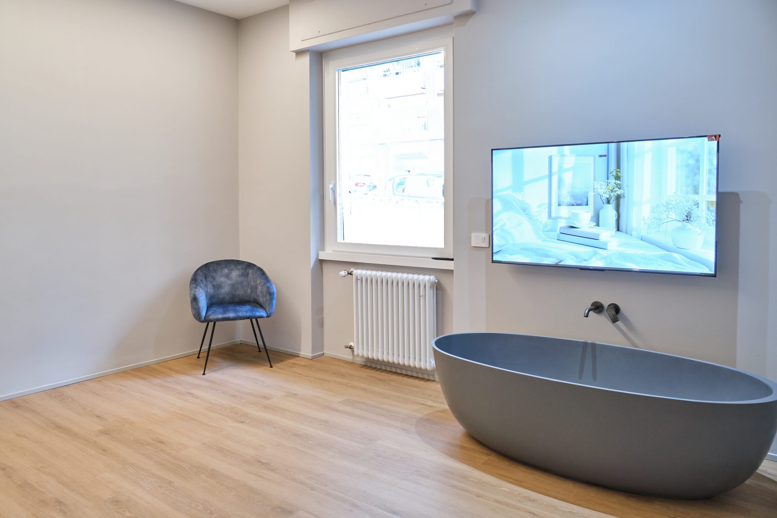 La vasca freestanding, accompagnata da un’illuminazione soft e da elementi di design, diventa il fulcro della zona benessere.